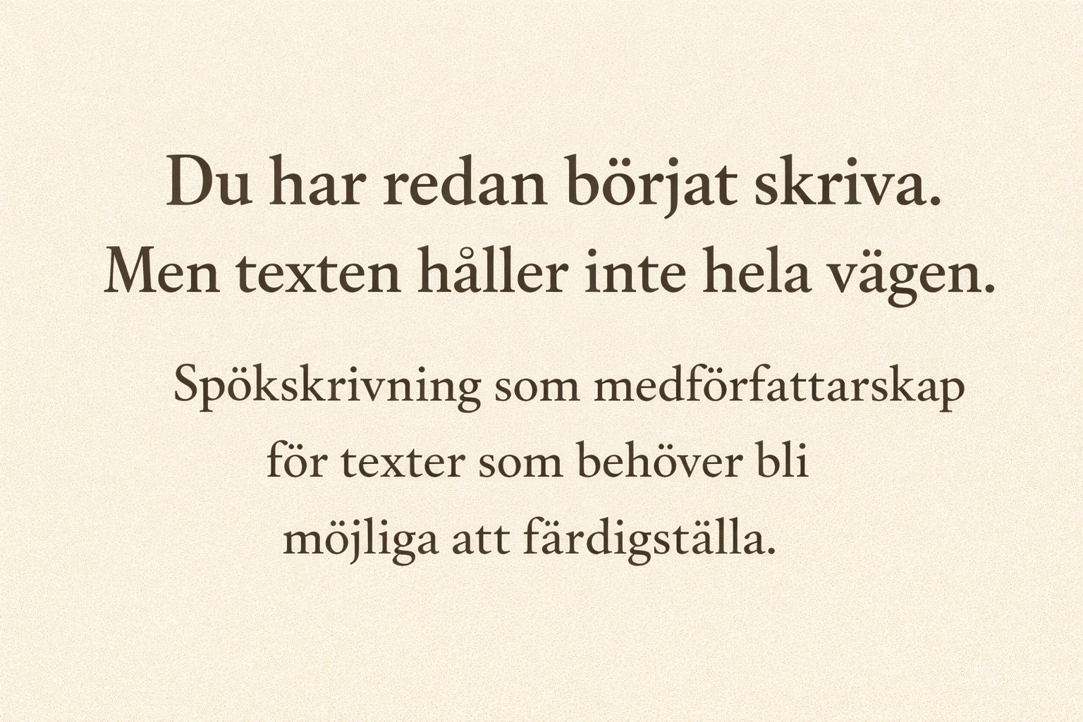 Det här är inte en genväg till en bok. Jag skriver inte böcker åt människor som inte själva vill – eller kan – skriva. Om du letar efter någon som kan ta dina lösa tankar, intervjua dig lite och sedan leverera ett färdigt manus utan att du själv behöver vara delaktig, då är jag fel person. Spökskrivning, som jag arbetar med den, är ett medförfattarskap. Du måste ha något på papper. Jag hjälper dig att göra det läsbart, sammanhängande och möjligt att färdigställa.